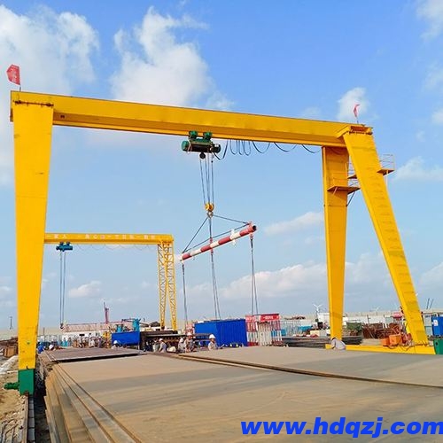 門式起重機是橋式起重機的一種變形,又叫龍門吊。主要用于室外的貨場、料場貨、散貨的裝卸作業。門式起重機具有場地利用率高、作業范圍大、適應面廣、通用性強等特點,在港口貨場得到廣泛使用。