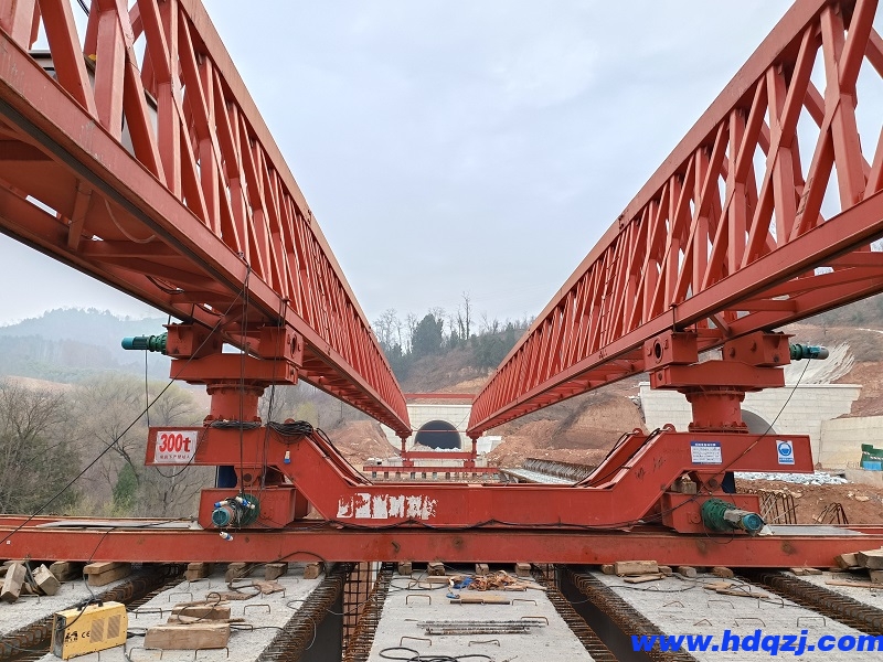 2. 架橋機對中完成后,仔細檢查對中情況,檢查前支腿是否挺直,橫向導梁的魚尾板、扣鐵、車輪擋塊是否牢固。在確認其可靠性后,就可以進行架梁操作。